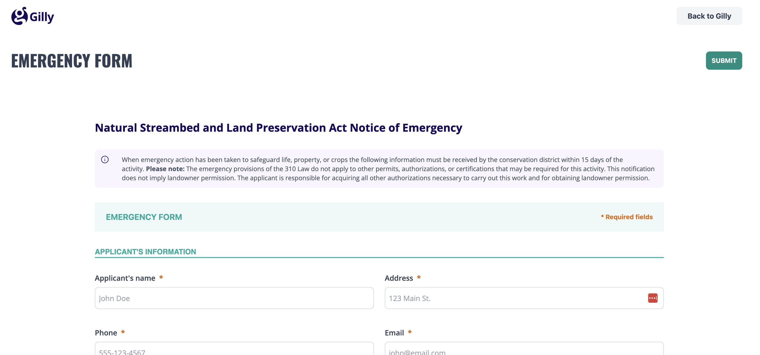 A new Emergency Permit Form is now available on Gilly to help applicants comply with the 310 Law during urgent situations. This dedicated form allows individuals to report emergency actions taken to protect life, property, or crops, and submit the required information within 15 days.